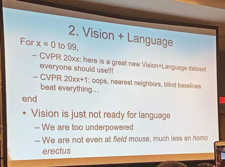 2,他认为短期内视觉无法和语言结合,抽象程度相差太多。Alexei Efros 挖苦说,最近几十年的 CVPR 论文可能都会反复上演这样的戏码:每一年都会有论文带来新的视觉+语言数据集,然后第二年发现在这个数据集上只需要用最近邻算法或者随便一个什么基准线方法就能打败所有别的方法。他说这是因为我们现在有的方法真的太弱了,还不足以把这两种模态的信息有效地提取、融合起来。「我们还没达到一只老鼠的视觉能力,怎么就开始想着做直立人做的事情了」