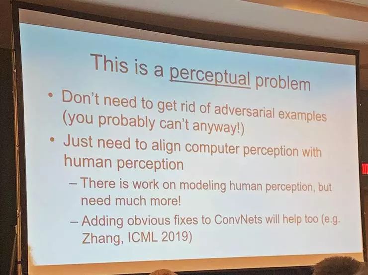 1,对抗性攻击和鲁棒性问题,他认为这不应该是个问题,没必要花那么多精力去想办法避免,实际上可能也永远都避免不了。因为对抗性样本本来就不是来自自然数据流形的数据,落在由自然数据流形所划分的决策边界上就是有可能的,所以这并不是一个数学问题,而是一个人类的感知问题。他的建议是只要我们让人类的视觉行为和计算机的类似就行了。换句话说,对抗性样本只是人类与计算机的感知特点不同的表现,而不是问题本身;如果想要治病,不要只吃止痛药(要研究感知特点,就不要紧盯着想要消灭对抗性样本);