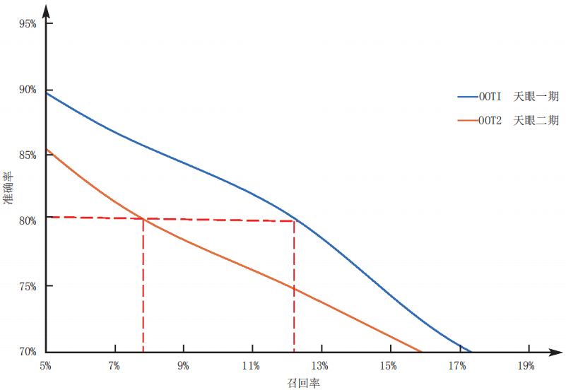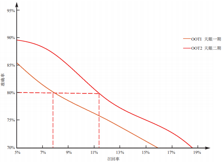 在天眼一期效果已经下降的 OOT2 中,天眼二期的召回率能在准确率为80%的情况下重新回到11.5%左右。