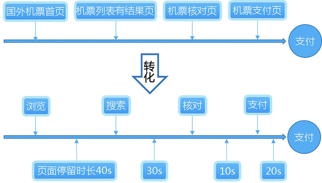 针对以上问题,我们花了大量时间对 UBT 数据进行了人工汇总,以业务理解为核心,有选择地将原本枯燥无味的页面转化为用户的行为动作,并将用户在页面的停留按照停留时长的分组转化为几种输入动作。业务转化示例如图4所示。