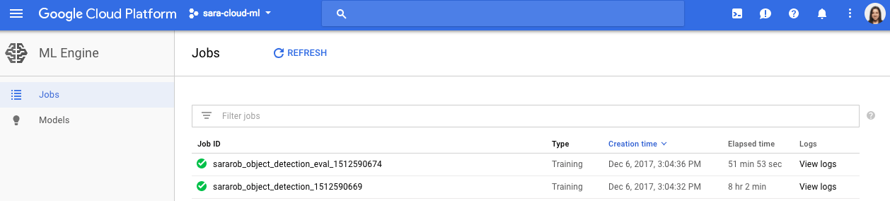 你可以通过在云端控制台导航到ML Engine的“作业”部分来验证您的任务是否正确运行,并检查日志以查找特定作业: