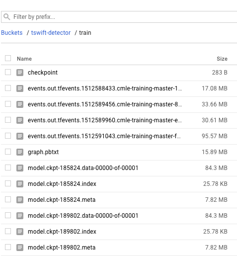 为了将模型部署到ML Engine,我需要将模型检查点转换为ProtoBuf。在我的train/bucket中,可以看到从几处保留的检查点文件: