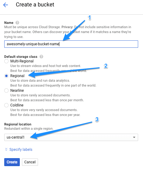 然后,我将创建一个云存储bucket来打包模型的所有资源。确保在指定区域进行存储(不要选择多个区域):
