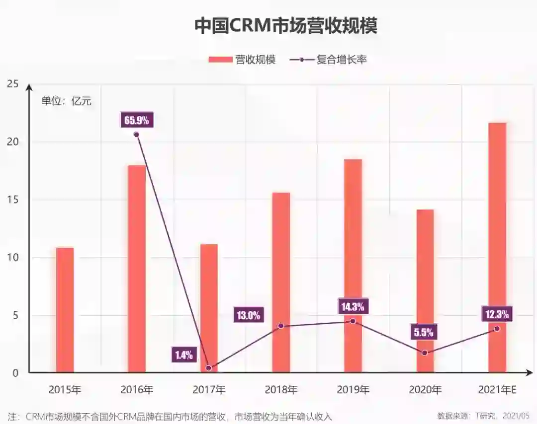 T研究发布的《2021中国CRM数字化全景实践研究报告》显示,中国CRM市场规模在2021年将达到21亿左右。