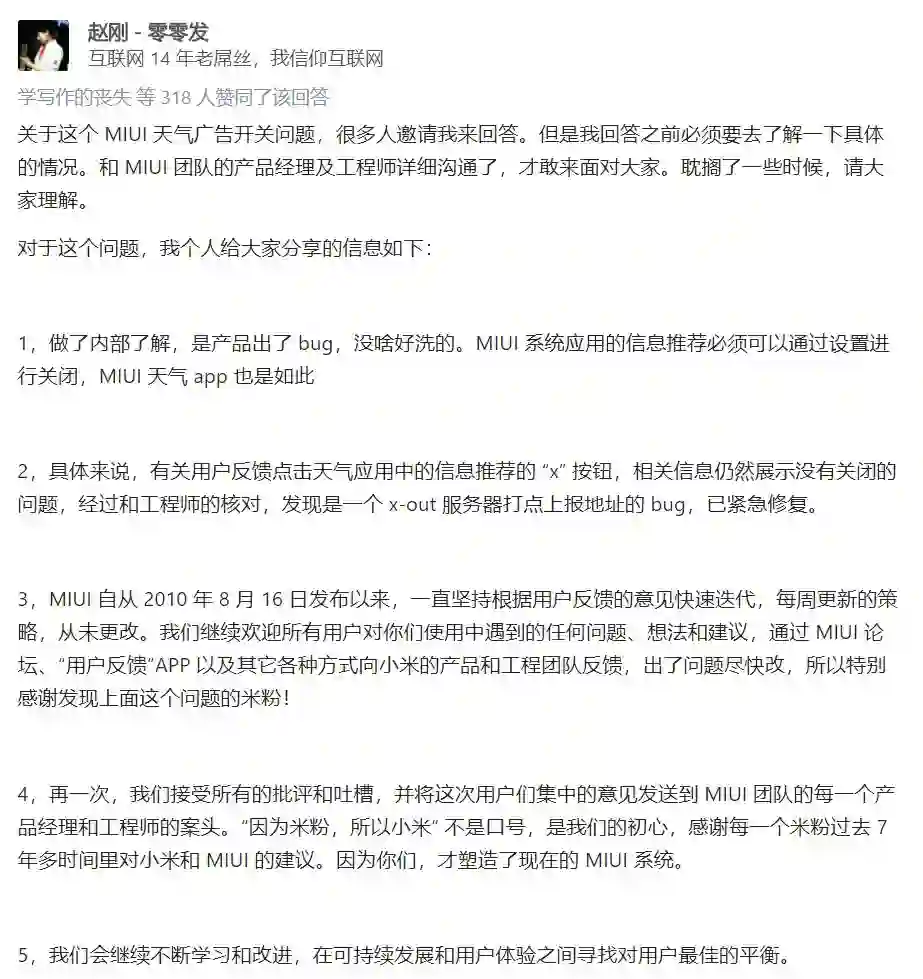 战场很快转移到了知乎,在“如何评价 2018 年开始,MIUI 逐步移除「广告关闭开关」并添加广告的行为?”这个问题下,也有不少知乎用户在抨击 MIUI 的此种行径。问题发酵至此,官方也坐不住了。在知乎上有一定影响力、Title 是“小米新媒体总监”的赵刚出面回应,称这是一个“Bug”: