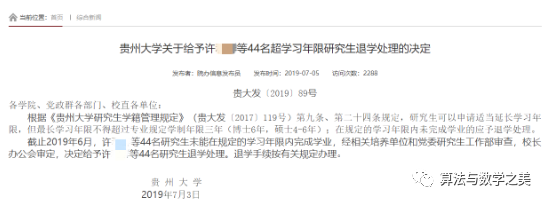 2019年7月5日,贵州大学研究生院官网发布了一则消息“贵州大学关于给予许某等44名超学习年限研究生退学处理的决定”。
