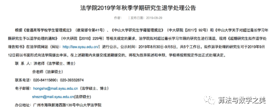 今天(8月30日),中山大学法学院在官网上发布关于《法学院2019学年秋季学期研究生退学处理公告》。拟退学处理的研究生共有53人,其中超期博士7人,超期法律硕士44人,超期学术型硕士2人。退学的原因主要是上述研究生超过了学习年限。