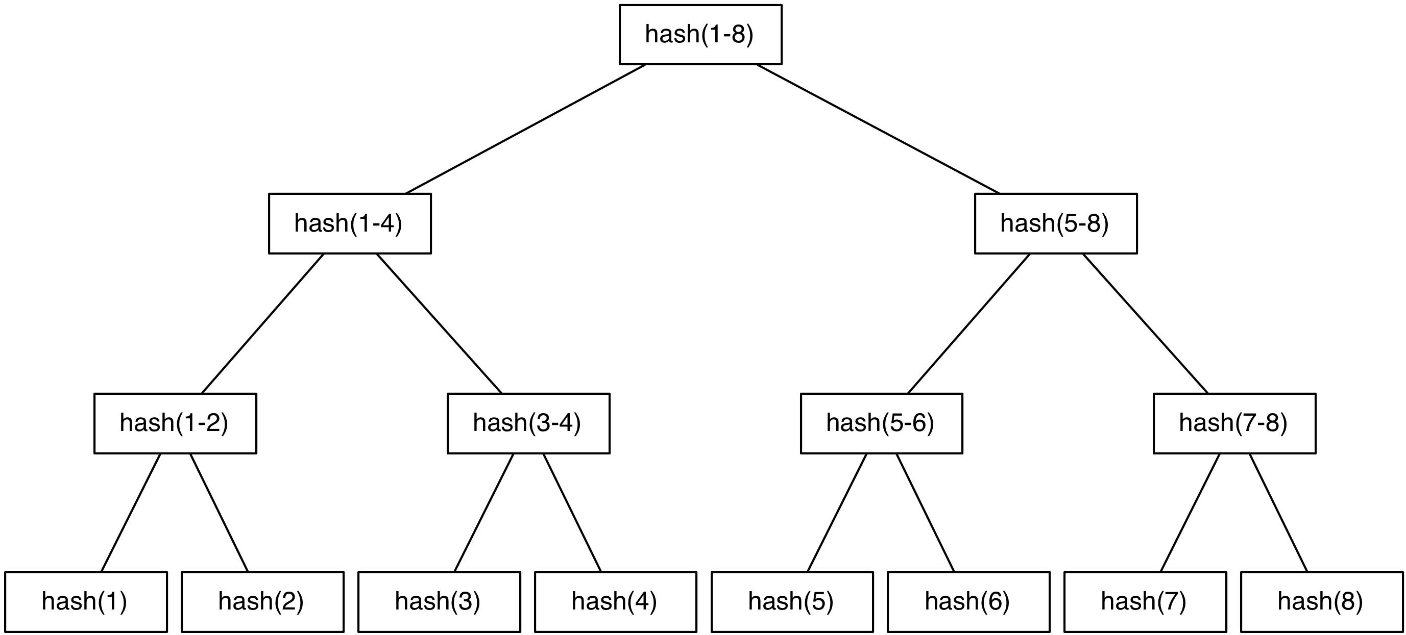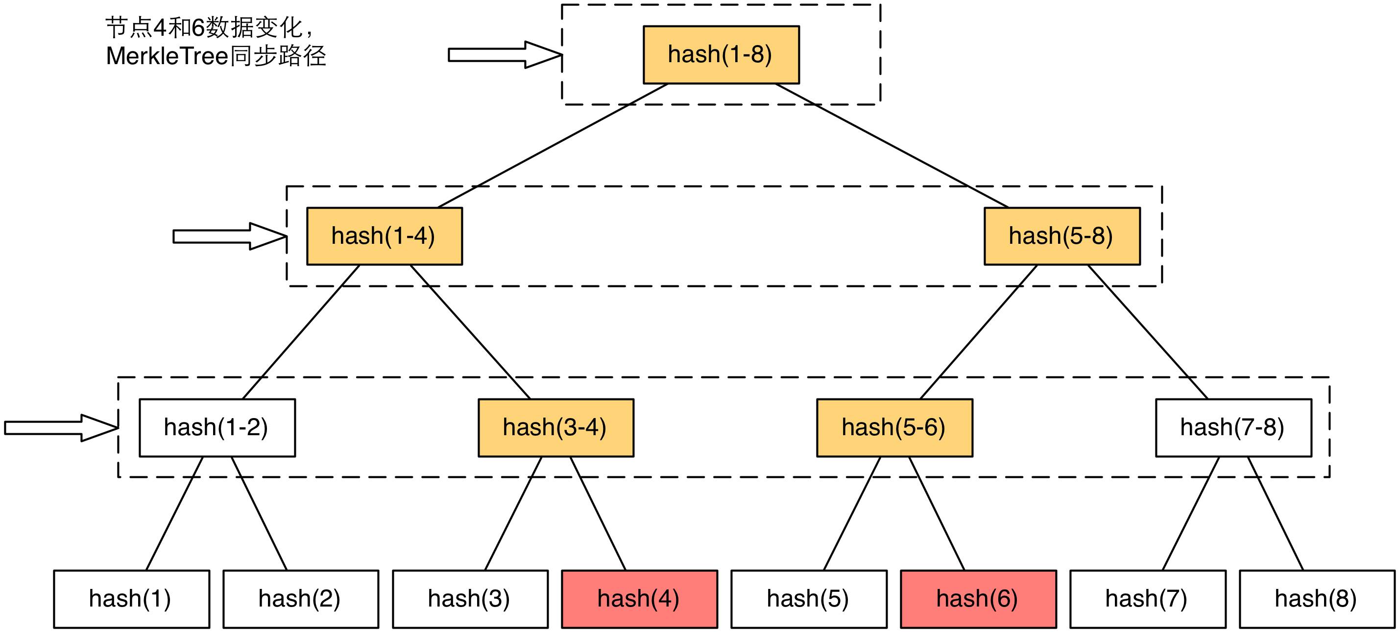 Merkle Tree同步协议由副本发起,将副本根节点值发送给数据源,若与数据源根节点hash值一致,则没有数据变动,同步完成。否则数据源将把根结点的所有儿子节点的hash发送给副本,进行递归比较。对于不同的hash值,一直持续获取直到叶子节点,就可以完全确定已经改变的数据。以二叉树为例,所有的数据同步最多经过LogN次交互完成。