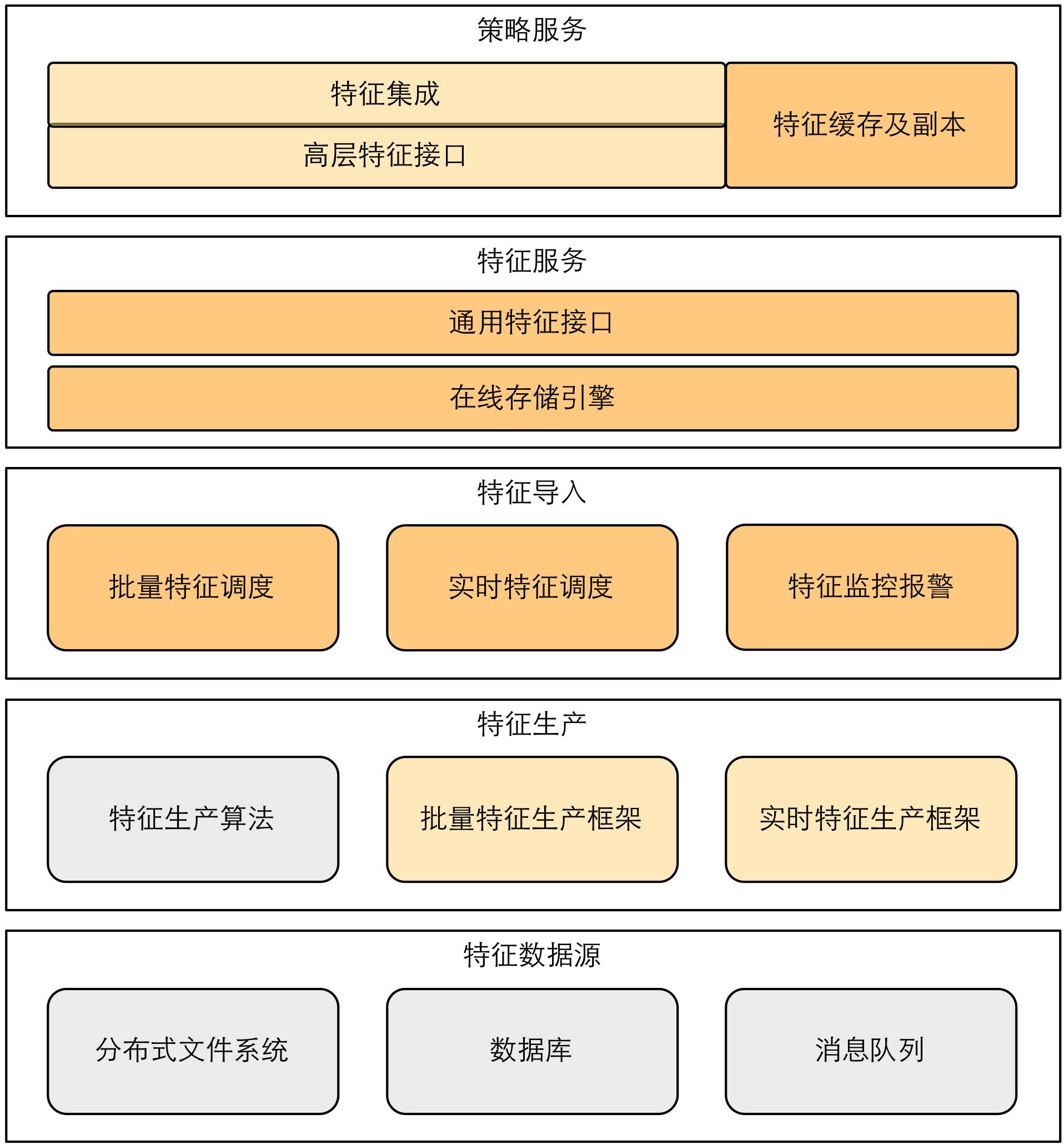 以上结构图为一体化特征系统的概貌,自底向上为数据流动的方向,各部分的功能如下: