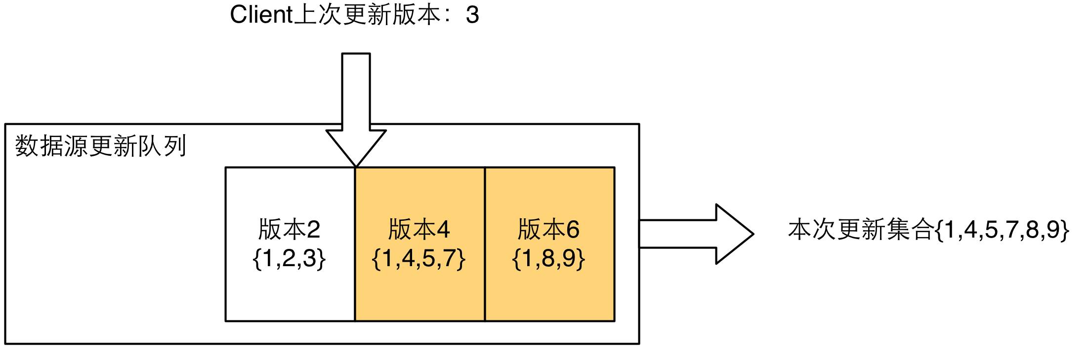 内存副本发起同步请求时,会携带该副本上一次完成同步时的最大版本号,这意味着所有该版本号之后的数据变化都需要被拉取过来。数据源方收到请求后,从更新队列中找到大于该版本号的所有数据变化,并将数据变化汇总,得到最终需要更新的Diff,返回给发起方。此时内存副本只需要更新这些Diff数据即可。