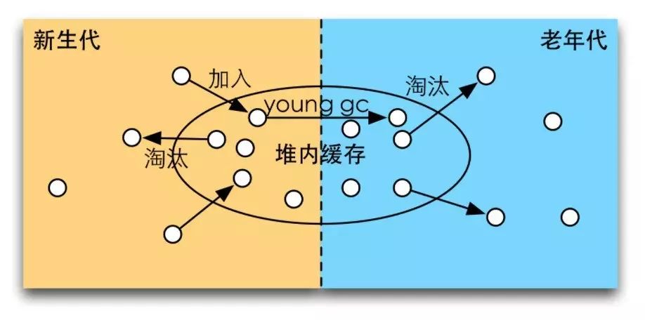 随着请求产生的数据会不断加入缓存,QPS较高的情形下,Young GC频繁发生,会不断促使缓存所占用的内存从新生代移向老年代。缓存被填满后开始采用Least Recently Used(LRU)算法淘汰,冷数据被踢出缓存,成为垃圾内存。然而不幸的是,由于频繁的Young GC,有很多冷数据进入了老年代,淘汰老年代的缓存,就会产生老年代的垃圾,从而引发Full GC。