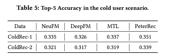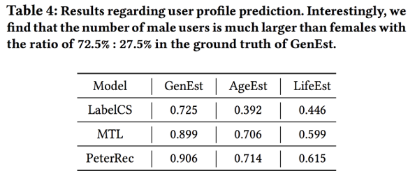 这一实验将 PeterRec 与常规的比较知名的 baseline 进行比较,包括冷启动推荐效果和用户画像预测效果。具体分析可参见原文分析。