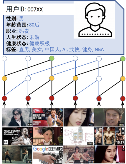 图 1: PeterRec 进行用户画像预测示意图。注意:PeterRec 不需要借助于任何图像和文本特征,仅需要用户点击物品 ID 即可。中间网络为大量堆叠的空洞卷积网络。