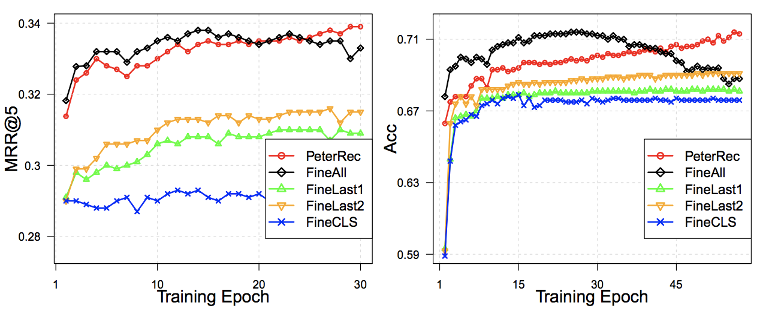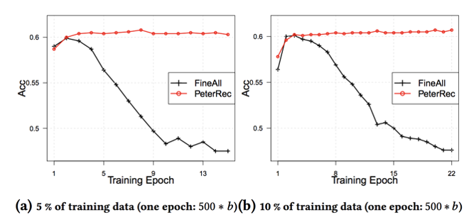 以下是几种微调方式比较,如图 5 所示。图中证实 PeterRec 仅仅微调模型补丁和 softmax 层参数达到了跟微调所有参数一样的效果,但是由于仅有少数参数参与优化,可以很好的抗过拟合现象。