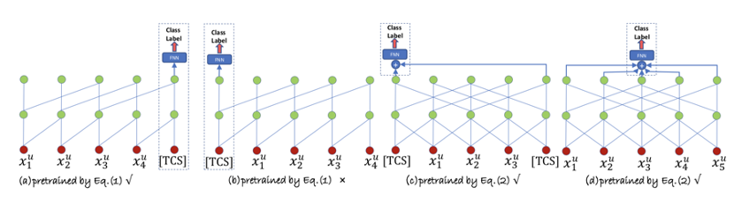 图 2: 采用空洞卷积网络的几种微调策略。(a)(b) 为因果卷积,(c)(d) 为非因果卷积。