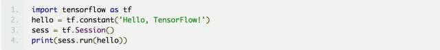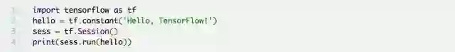 为验证是否安装成功,使用 $python 开启 python,运行以下脚本确保输出打印 Hello, TensorFlow!