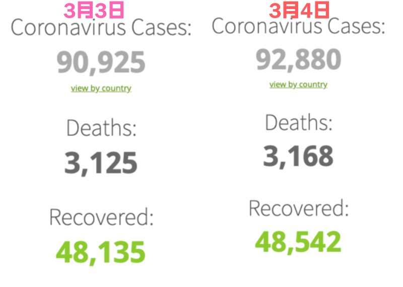 目前来看,虽然中国疫情蔓延的势头暂时有所减缓,但依旧不能掉以轻心,毕竟在全球范围,疫情才刚刚开始疯狂蔓延,仅仅一天时间确诊人数就激增了近2000人。下图分别是3月3日10点左右和3月4日9点左右得到的统计数据:
