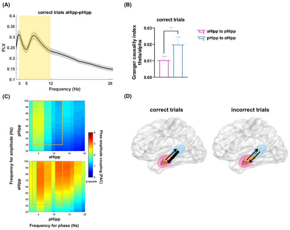 研究发现,在工作记忆维持期间海马体前后亚区低频神经振荡活动显著升高,说明海马体前后亚区均参与了工作记忆认知过程。在3-12Hz频段,海马体前后亚区之间相位同步活动增加,而且在该频段内后海马驱动前海马完成神经信息传递,后海马在该频段的相位与前海马的高频幅值存在显著耦合的关系。这些现象在错误加工工作记忆时消失。以上结果说明海马体前后亚区通过特定的神经信息传递方向以支持正确的工作记忆加工。