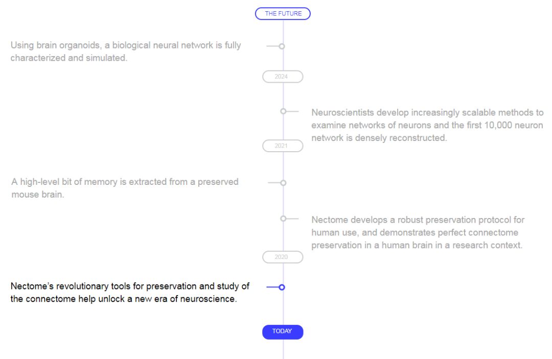 Nectome 正在研究如何保存人脑从而维持神经元间的连接。有人推测这样的“连接组”(connectome)能够保持个体的记忆信息。该公司已经获得联邦政府拨款,达成了与 麻省理工学院顶级神经科学家 Edward Boyden 的合作。此外,Nectome 的技术因成功保存了一只猪脑而赢得了价值 8 万美金的科学奖,由于大脑保存得极其完好,以至于每一个突触在电镜下都清晰可见。