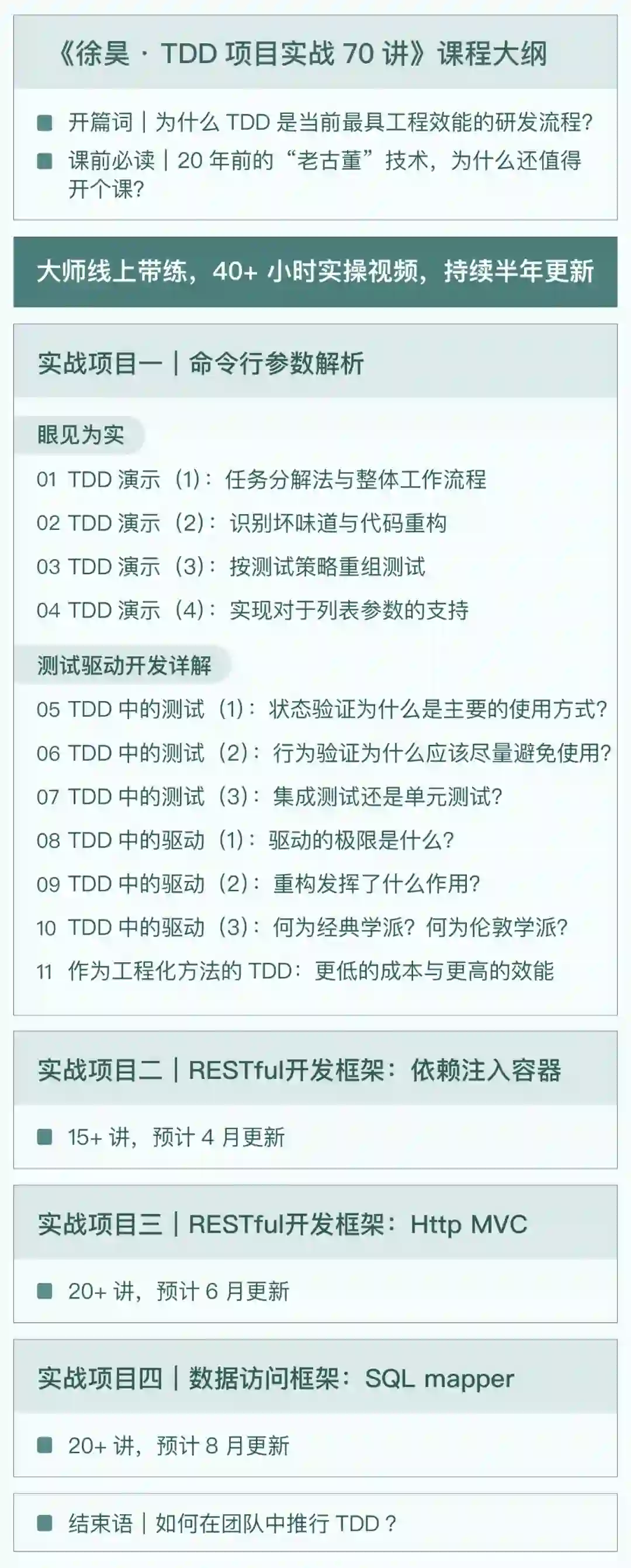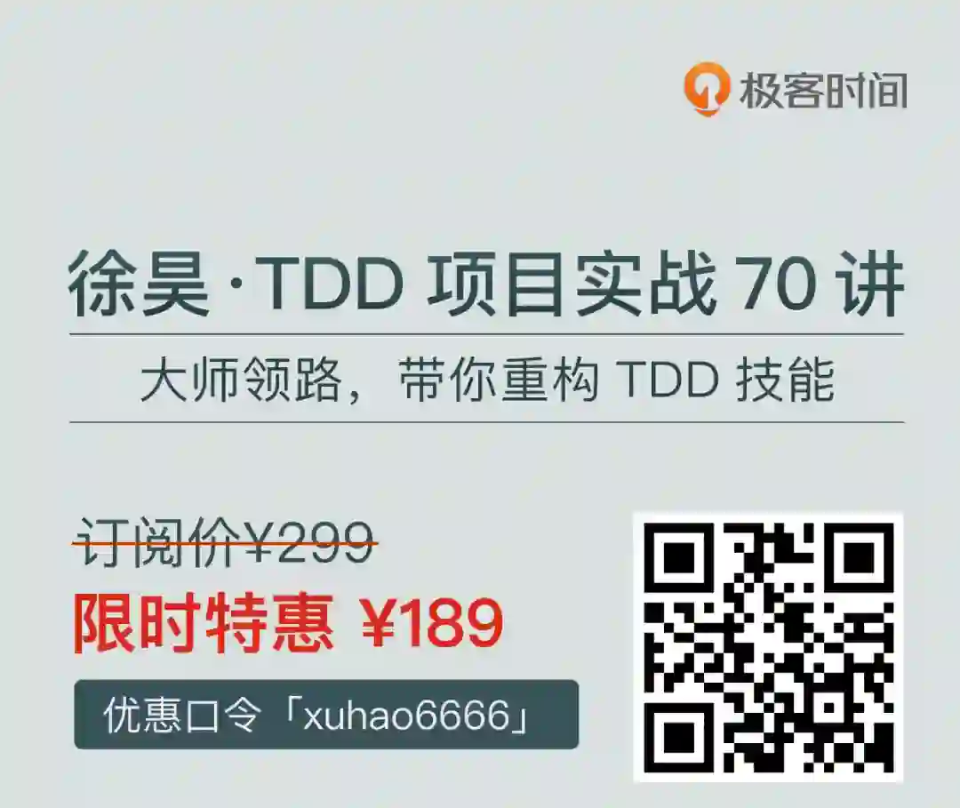 如今,徐昊把他自己和团队多年的关于 TDD 实践经验都融合在了这个《徐昊·TDD 项目实战开发 70 讲》的极客时间专栏里,包含超过 70 讲内容、40 + 小时视频演示, 4 个完整的项目实践。通过它,你绝对可以搞定需求难理解、任务难拆分、TDD 难落地等难题。