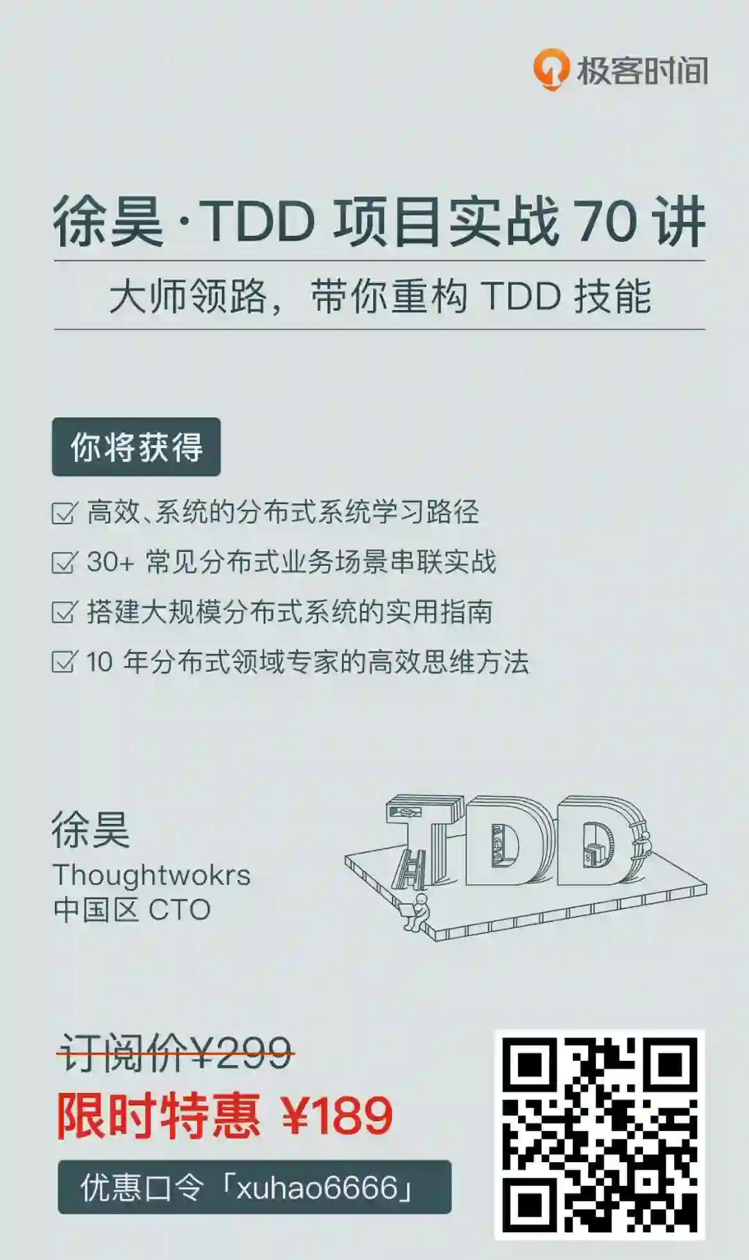 徐昊已经跟 TDD 打了将近二十年交道,多次帮国内外的大小团队成功解决了 TDD 的落地,还发明了以 TDD 为核心的高效工作法,经验丰富。所以,想解决 TDD 使用过程中的问题,或对 TDD 感兴趣想多了解,他的专栏绝对是首选。