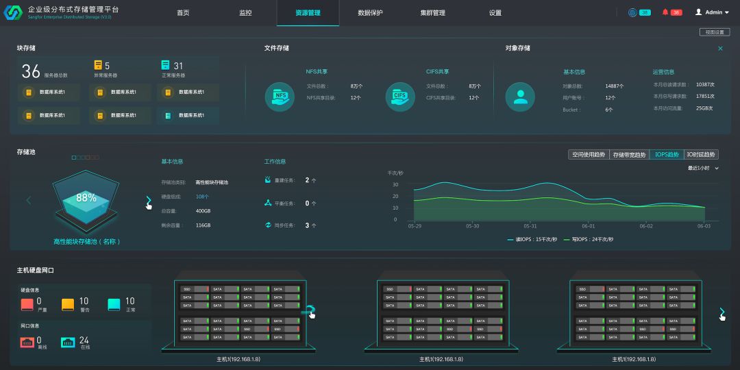 深信服企业级分布式存储aStor-EDS采用全对称分布式架构,支持数千节点集群部署,灵活扩展的同时保持更高的性能,最大可扩展EB级存储空间、1,000万IOPS高性能支撑,实现了一套硬件资源池上,可同时提供块、文件、对象三种存储服务。