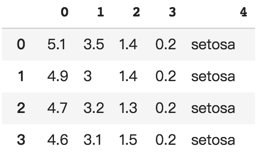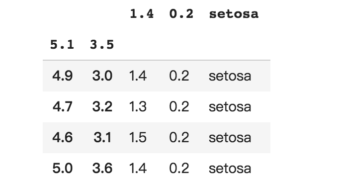 [['5.1', '3.5', '1.4', '0.2', 'setosa'], ['4.9', '3', '1.4', '0.2', 'setosa'], ...