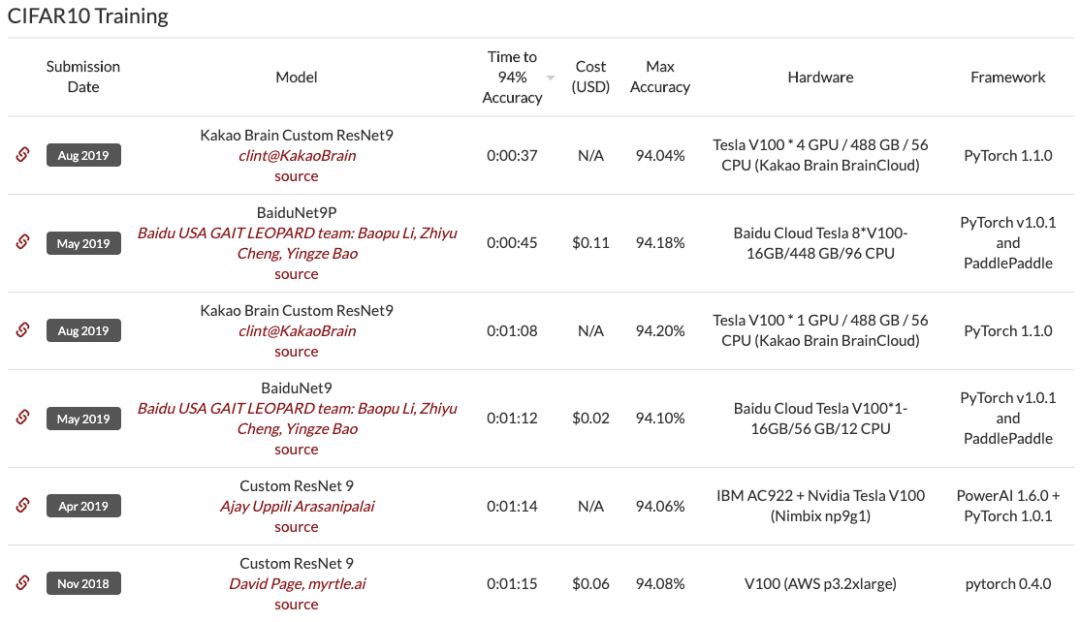 以上为目前的 DAWNBechmark,排名最高的模型用时 37 秒。
