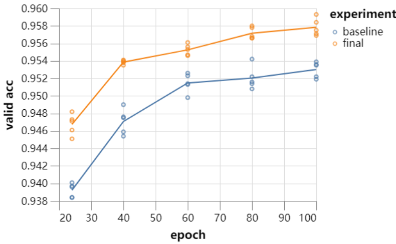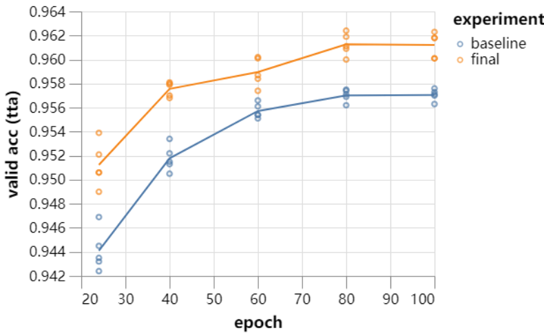 测试准确率提升到了 94.2%(50 次运行的平均值)。而减少了 Epoch 的数量后,训练 23 个 Epoch 的准确率就达到了 94.1%,但是训练时间降到了 1 分钟以下。