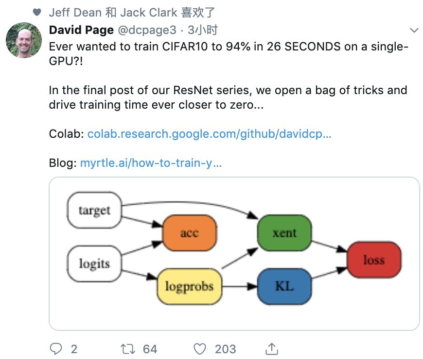 myrtle.ai 研究科学家 David Page 的推特,获得了 Jeff Dean 的点赞。