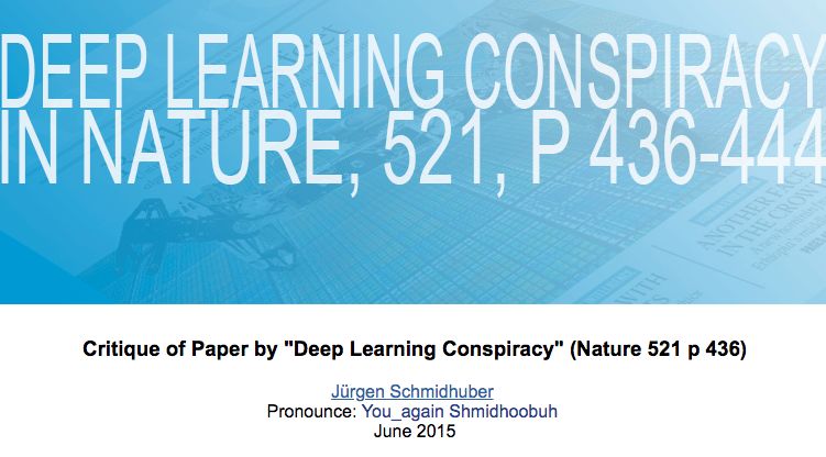 Schmidhuber在文中表示,这篇文章让他非常不爽,因为全文多次引用三位作者自己的研究成果,而对于其他先驱人物对深度学习更早的贡献则只字不提。