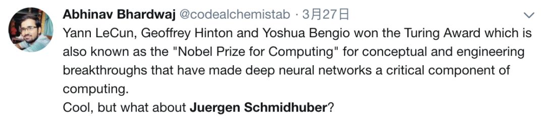 Yoshua Bengio、Geoffrey Hinton和Yann LeCun获得了图灵奖(计算机界的诺贝尔奖),让深度神经网络成为计算机中的重要环节。非常酷!但是Jürgen Schmidhuber呢?