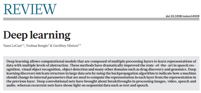 2015年5月,Bengio、Hinton和LeCun三位大神联手在Nature上发了一篇review,题目直接就叫《Deep Learning》。此文从传统的机器学习技术讲起,总结了现代机器学习的主要架构和方法,描述了训练多层网络架构的反向传播算法,以及卷积神经网络的诞生,分布式表示和语言处理,以及递归神经网络及其应用等等。