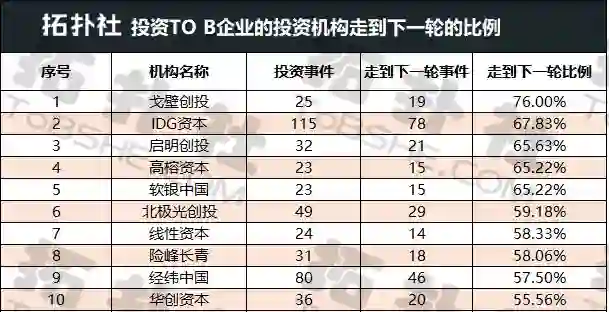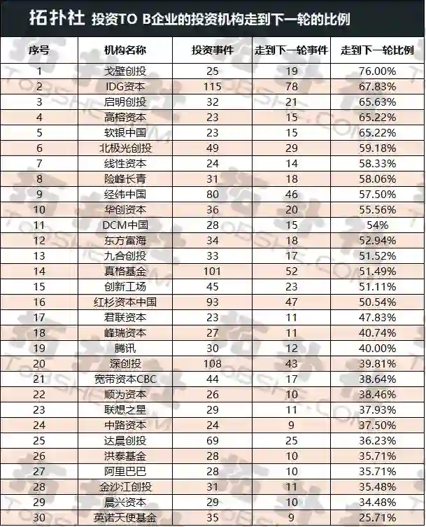 通过盘点投资机构在企业服务方向所投企业走到下一轮的比例,拓扑社(ID:tobshe)排列出了 To B 领域投资机构的前 30 强,并对其中具有代表性的机构的分析,从而让我们发现,哪些投资机构最能慧眼识英才。