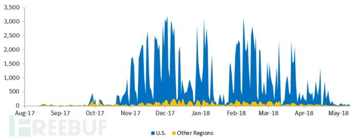 多年来,Emotet的地理目标也在显著增加。在经历了2015年以来相对平静的一段时期之后,在2017年下半年,Emotet的检出率开始激增。而在那一年,Mealybug的目标包括了位于加拿大、中国、英国和墨西哥的受害者。然而,根据赛门铁克2018年上半年的遥测数据显示,其关注的焦点目前主要集中在位于美国的目标身上。