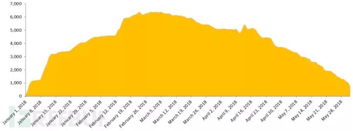 图3. 2018年1月1日至5月28日期间的W32.Qakbot检测率