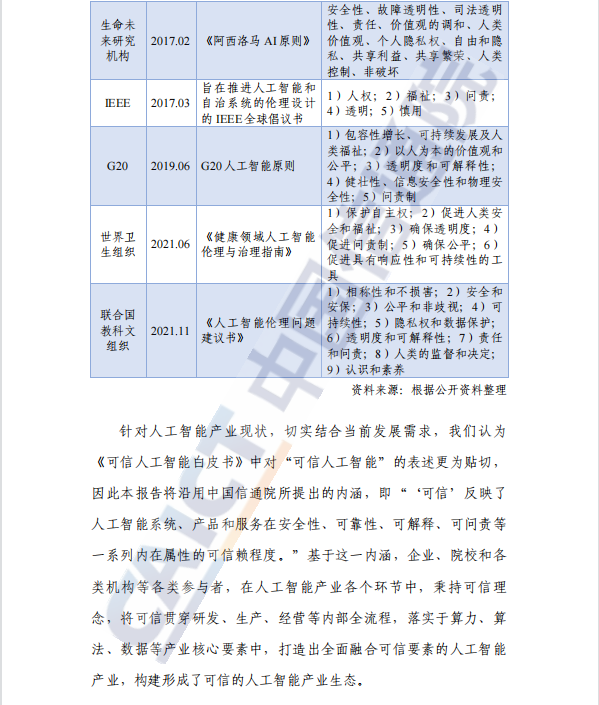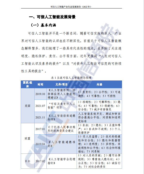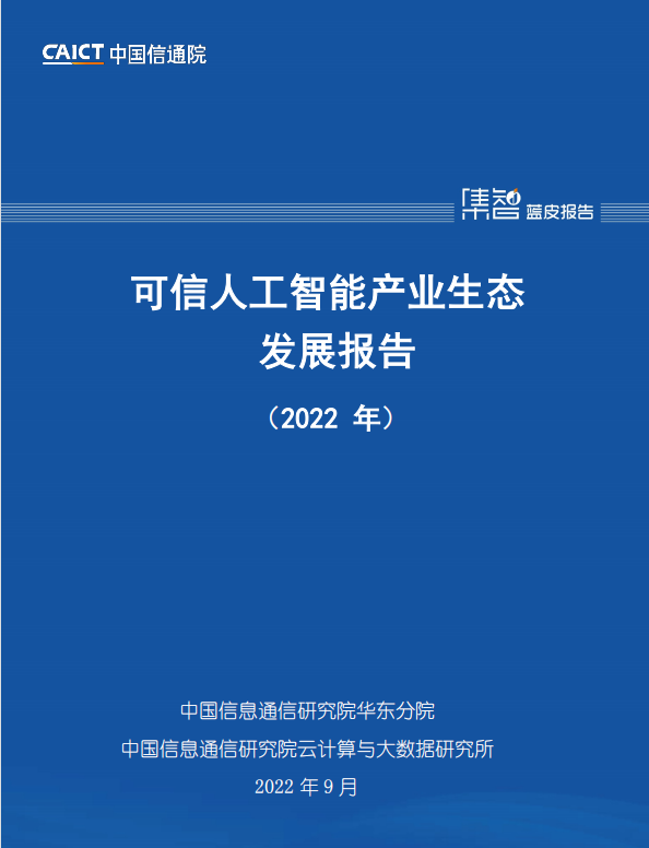 来源:中国信息通信研究院随着新一轮科技革命和产业变革的深入推进,人工智能呈现爆发式成长,广泛应用于日常生产、生活的方方面面,社会各界对可信品质的关注度也提升到了前所未有的高度。近年来,各界均在不断探索将更多的可信理念从基础能力、算法技术、应用场景和产品设备等不同层面进行融合实践,实现了人工智能在安全性、可靠性、可解释、可问责等一系列内在属性的可信赖程度逐步提升,为构建我国可信人工智能产业生态提供了有益参考。为广泛吸纳产学研用各界的优秀经验,中国信息通信研究院联合京东探索研究院及政产学研多家单位共同编写《可信人工智能产业生态发展报告》,对人工智能产业融合可信要素的发展态势进行总体分析,研判发展趋势并提出措施建议,希望能为社会各界提供借鉴和参考。报告主要观点如下:全球可信人工智能发展态势向好。人工智能监管向立法执法拓展,欧盟发布全球首部《人工智能法案》,美国推出《2022 算法问责法案》,中国人工智能地方立法相继落地;稳定性、隐私保护成为热点,可解释性、公平性等研究正逐步开展;标准层面,行业组织、企业和研究机构共同推进,全力打造可信 AI 标准体系。可信人工智能产业生态加快形成。可信人工智能伦理、法律研究进一步深入,在硬件、技术、应用及支撑体系等层面蓬勃发展,形成兼顾稳定性、可解释性、隐私保护和公平性,涵盖基础硬件、技术平台、产品设备、应用场景等多元化产业生态。未来,可信人工智能向着形成产业共识、突出理念落地、优化技术布局、注重动态平衡、强化多元主体发展。凝聚强化产业共识,进一步向具体实践迈进,可信人工智能一体化研究和技术发展加速创新,能力之间的动态平衡引发更多关注,并形成了多元化主体参与的可信人工智能生态。建议从加强要素协同、前瞻布局研究、健全标准体系、强化可信流程管理、推动产业交流合作等方面推动深入落地。协调制度、技术、人员整体推进;前瞻布局技术研究,将可信理念融入全流程管理;健全标准评估体系,系统性推进更多领域可信落地;强化产业交流合作,共同打造可信产业生态朋友圈。