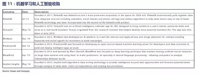 5、机器学习给智能客户关系领域带来了变革,Salesforce 迅速成为了行业领头羊。Salesforce 正在进行一系列的并购活动。下图中的表格来自柯文公司的研究报告(Salesforce: Initiating At Outperform; Growth Engine Is Well Greased),总结了 Salesforce 并购的一系列机器学习和人工智能公司,并分析了他们的新产品发布走向以及并购带来的预估收益贡献。Alex Konrad 在他最近发表的博文(Salesforce Will Acquire Demandware For $2.8 Billion In Move Into Digital Commerce)中分析了 Salesforce 用 28 亿美元收购电子商务供应商 Demandware 一事。柯文公司预测 18 个 财政年度中,Commerce Cloud 会贡献 3.25 亿美元的收入,其中卖出 Demandware 的收入占了很大一部分。