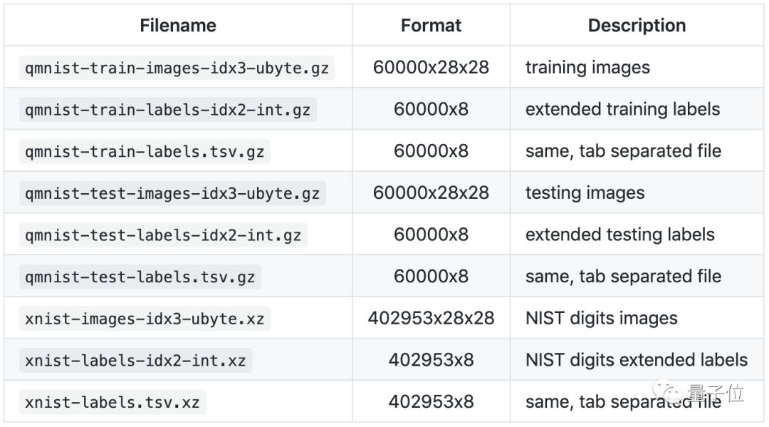 其中,前两个gz压缩文件和标准MNIST数据文件格式相同,不同的是QMNIST包含6万个测试样本。