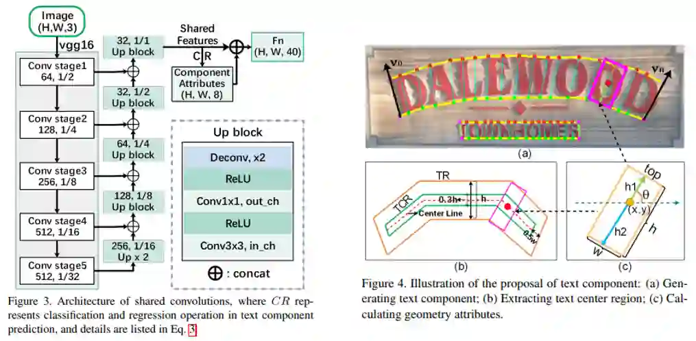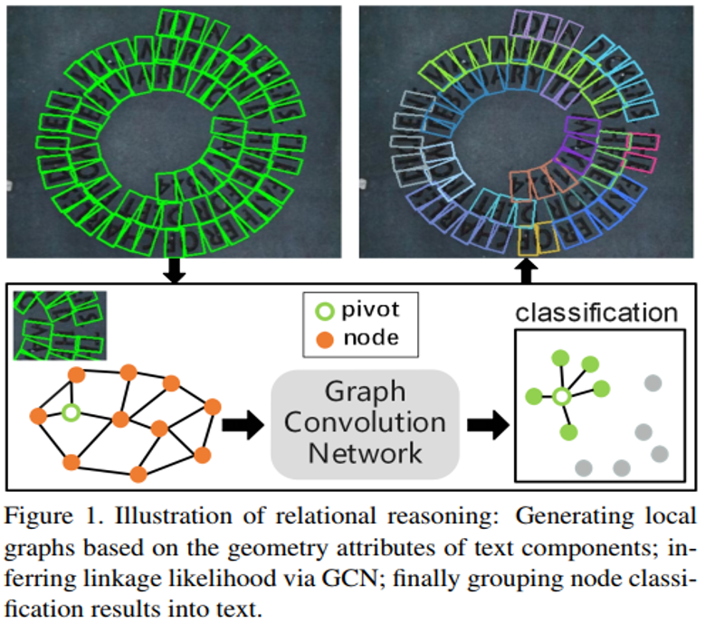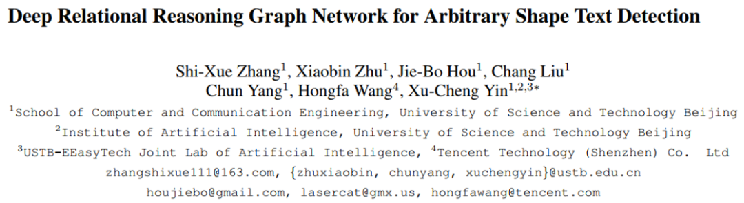 图像文本检测一种常用的思路就是,首先找出文字/文本的基本区域或部件,然后分析这些部件之间的相互关系,再利用知识规则或学习策略来连接这些部件,最后构造出所需要的文字/文本区域,完成文本检测与提取。这就是文本检测传统方法中基于文字/文本连通域分析的经典技术[1,2,3],也是文本检测深度学习方法中基于文字/文本组件连接的流行技术[4,5,6]。本CVPR 2020(Oral)论文(”Deep Relational Reasoning Graph Network for Arbitrary Shape Text Detection”)就是一种新的基于组件连接的文本检测技术[7],构建了深度关系推理图网络,有效地学习与推理文字/文本组件之间的连接及语义关系,高精度地检测复杂场景图像中的任意形状文本。