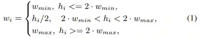 对于文本组件预测网络(如图4所示),每个文本组件需要获得其几何属性,包括中心坐标、宽、高和旋转角。这里,组件的中心点坐标通过计算得到,文本组件的旋转角通过预测文本组件的旋转角的sin值和cos值得到,组件高度(H)通过预测当前参考点到文本组件上边界距离(h1)以及到下边界的距离(h2) 来获得,组件的宽(w)通过公式(1)计算得到,