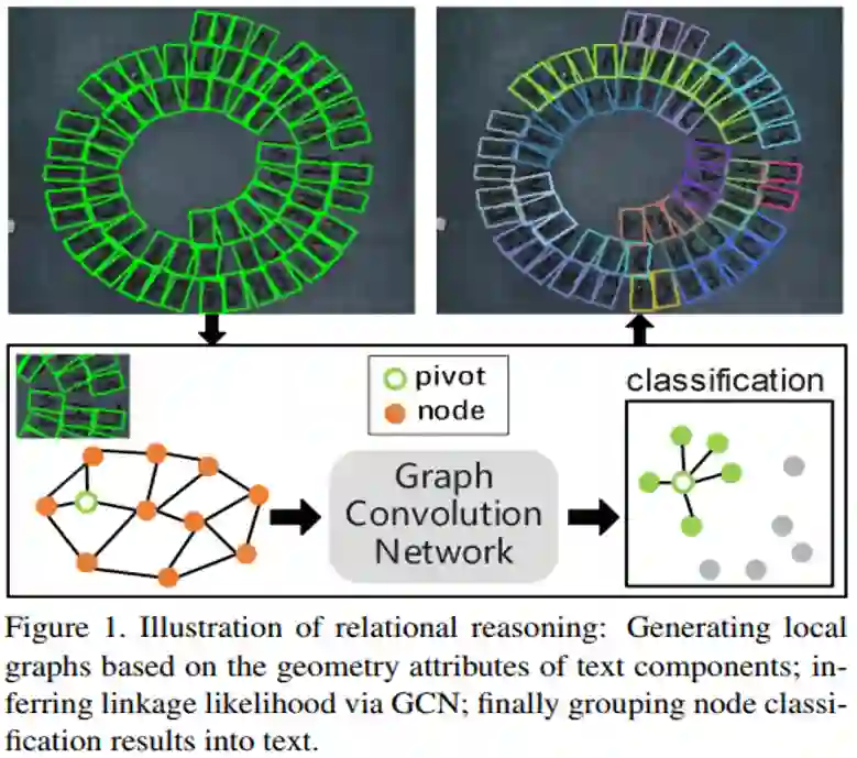 这篇CVPR 2020论文(”Deep Relational Reasoning Graph Network for Arbitrary Shape Text Detection”)提出了一种基于文字/文本组件连接的检测任意形状的方法,利用图卷积神经网络来进行组件之间的深度关系推理,有效地解决了复杂情况下文本组件的连接问题(如图1所示)。该方法将每个文本实例表示成许多个矩形的文本组件,然后把每个文本组件视为一个节点,通过该论文提出的局部子图(Local Graph)将同一张图中的文本组件节点划分成多个子图,每个子图包含一个中心节点和其二阶以内的邻居节点,最后通过一个图卷积神经网络模型进行学习和推理中心节点与其邻居节点的关系。同时,在局部子图的桥接下,文本组件预测模型(CNN)和关系推理模型(GCN)组合成了一个端到端可训练的任意形状文本检测系统。实验证明,该方法在多个场景文本检测数据集上达到了State-of-the-art的效果。