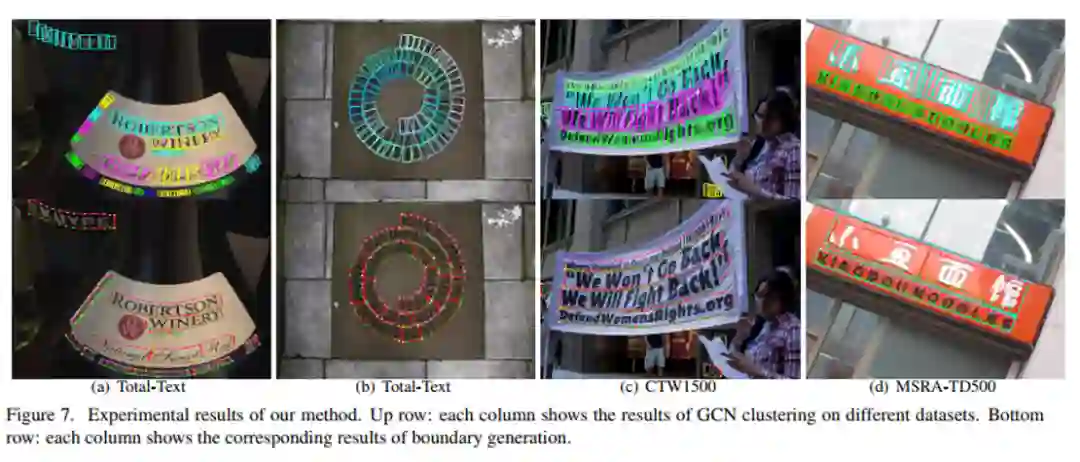 图7展示了一些可视化的场景文本检测结果图。该方法能够较好地检测任意形状的场景文本,并且在长文本且字符间距较大的情况下也能取得很好的检测性能。