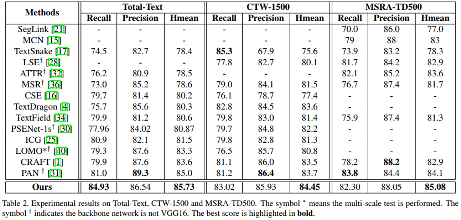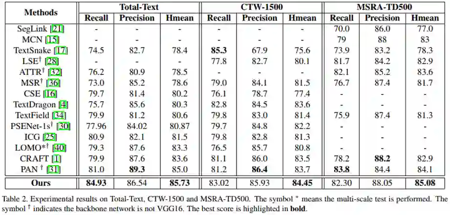 从表2来看,该文的方法在曲形文本数据集(Total-Text和CTW1500)以及多语言长文本数据集(MSRA-TD500)上都取得了State-of-the-art的检测效果。