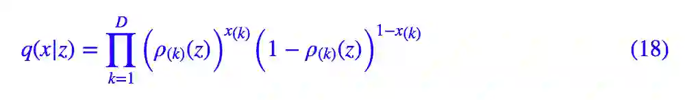 所以伯努利分布只适用于 x 是一个多元的二值向量的情况,比如 x 是二值图像时(mnist 可以看成是这种情况)。这种情况下,我们用神经网络 ρ(z) 来算参数 ρ,从而得到: