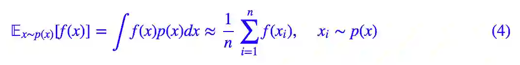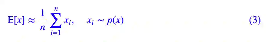 我们可以比较 (2) 跟 (3),它们的主要区别是 (2) 中包含了概率的计算而 (3) 中仅有 x 的计算,这是因为在 (3) 中 xi 是从 p(x) 中依概率采样出来的,概率大的 xi 出现的次数也多,所以可以说采样的结果已经包含了 p(x) 在里边,就不用再乘以 p(xi) 了。