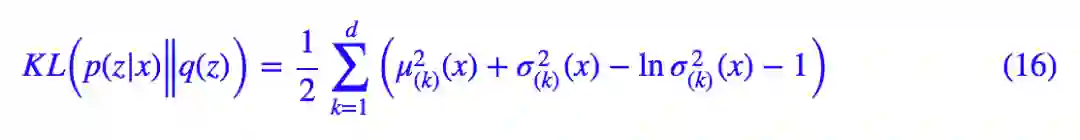 前一节做了那么多的事情,无非是希望能将 (13) 式明确地写下来。当我们假设 p(z|x) 和 q(z) 都是正态分布时,(13) 式的 KL 散度部分就已经算出来了,结果是 (16) 式;当我们假设 q(x|z) 是伯努利分布或者高斯分布时,−lnq(x|z) 也能算出来了。