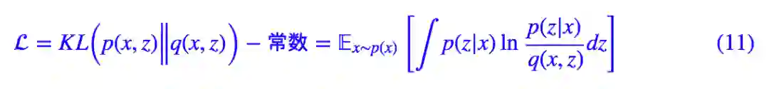 目前最小化 KL(p(x,z)‖q(x,z)) 也就等价于最小化 L。注意减去的常数一般是负数(概率小于 1,取对数就小于 0),而 KL 散度本来就非负,非负数减去一个负数,结果会是一个正数,所以 L 恒大于一个某个正数。
