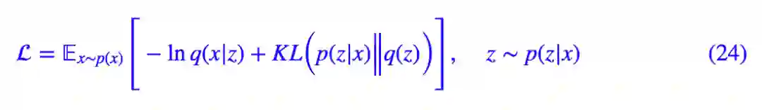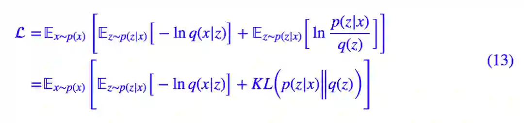 看,括号内的不就是 VAE 的损失函数吗?只不过我们换了个符号而已。我们就是要想办法找到适当的 q(x|z) 和 q(z) 使得 L 最小化。