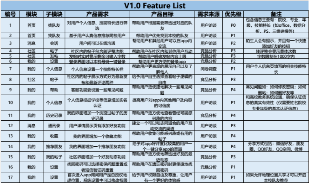 基于前期调研分析,了解到用户具有目标性非常明确的需求,以此为核心,有针对地提供筛选机制,高效寻找所需队友,建立需求池&Feature List;
